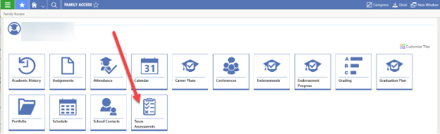 Parents and students can log in to their Skyward account and click on the Texas Assessment tile as shown in the image below. This will provide them with their Portal Access Code. They can click on the hyperlink, and it will take them directly to their child’s STAAR data.